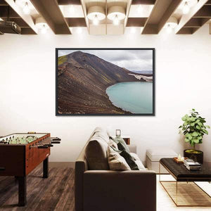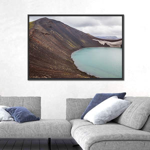 Vulcano Crater With Water in Iceland shows a volcanic crater lake framed by steep slopes and a snow-capped ridge. Diagonal, curved lines and a palette of blues, browns and greys highlight turbulent water, dark volcanic soil and patches of green vegetation, creating a vast, serene and dramatic scene that fits modern living rooms or offices.