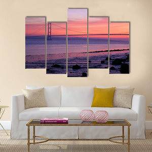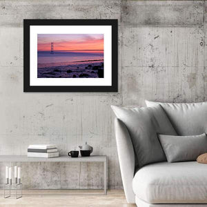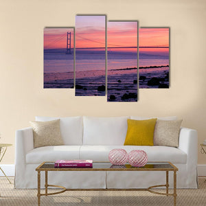 Warm Humber Bridge Canvas Wall Art shows a suspension bridge and rocky coastline at sunset in photorealistic detail, with purple, pink and orange tones for a serene, atmospheric mood. The calm water and streaky clouds make it a quiet focal piece for modern living spaces.