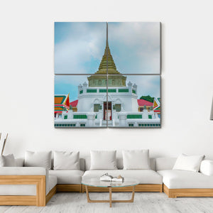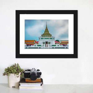 This canvas art features the serene and majestic Wat Kaliyamit Woramahawihan temple in Thailand, showcasing its stunning white architecture and golden spire against a background of blue sky and clouds. It invites a spiritual atmosphere into your space, making it suitable for various décor styles.