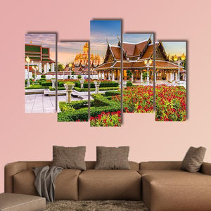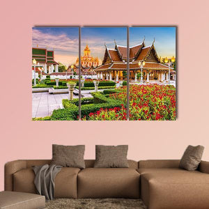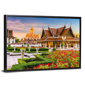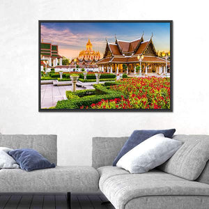 Wat Ratchanatdaram in Bangkok is presented as a vibrant, serene temple landscape with tiered roofs, ornate architecture, lush foliage, and flowers. The composition follows the rule of thirds and uses gold, green, red and blue tones to create an exotic, peaceful atmosphere. Works well in living rooms, hallways, or a quiet corner that could use a colorful, contemplative scene.