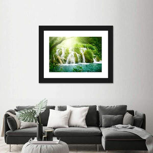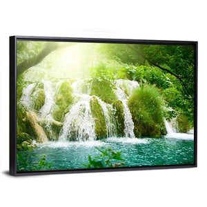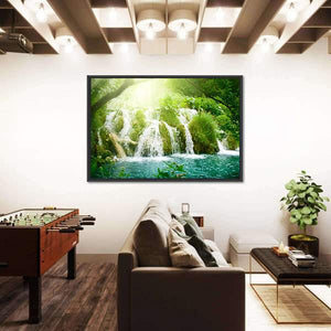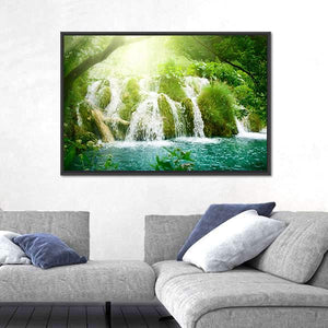 This stunning canvas captures the refreshing beauty of a waterfall nestled deep within a lush forest. The vibrant greens and soft blues evoke a serene atmosphere, perfect for enhancing your home decor.