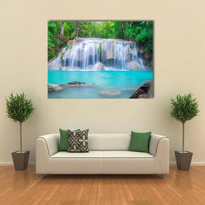 This realistic canvas art captures a multi-tiered waterfall surrounded by lush green foliage and clear turquoise water. Its serene and refreshing mood brings a touch of nature into your space.