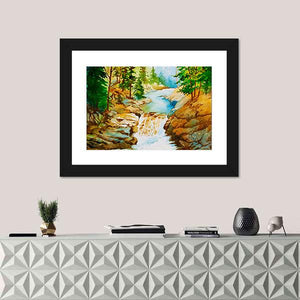 Experience the serene beauty of a waterfall cascading over rocks, surrounded by lush green trees and a tranquil river. This watercolor art brings a refreshing and natural vibe to your space, making it a perfect addition to any room decor.