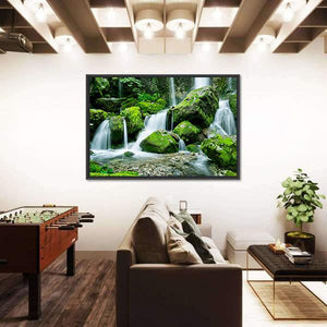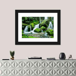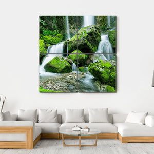 Experience the serene beauty of Slovenia with our canvas wall art featuring a captivating waterfall surrounded by moss-covered rocks and lush forest. The refreshing palette of greens, whites, and browns invites a natural ambiance to your space.