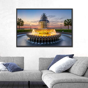 This canvas art features the iconic pineapple fountain in Charleston, surrounded by lush palm trees and vibrant water. The serene sunset colors of blue, orange, and yellow create a tranquil atmosphere, making it a captivating addition to your wall decor.