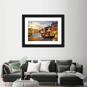 A realistic canvas scene of a gondola gliding along the Grand Canal at dusk, with Venetian buildings, a lit street lamp, and warm lights reflecting on the water. The golden, blue, brown, and white palette creates a serene, romantic atmosphere that suits modern living rooms, hallways, or travel-themed spaces.
