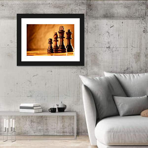 This canvas wall art features a close-up of wooden chess pieces arranged on a chessboard, capturing a strategic and sophisticated vibe. The rich brown and gold tones create a classic atmosphere, perfect for enhancing any room with a dramatic touch.