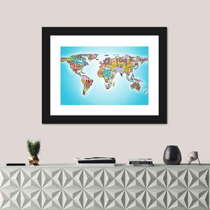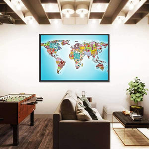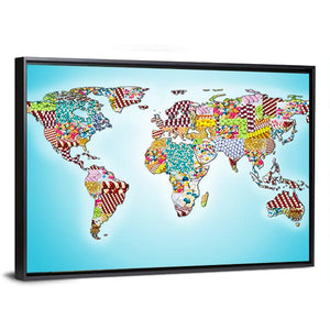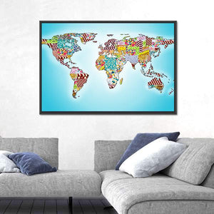 This vibrant canvas features a whimsical world map, where continents are depicted with playful patchwork patterns. Its colorful palette of blue, pink, and yellow adds a lively touch, making it a great addition to any artistic setting.