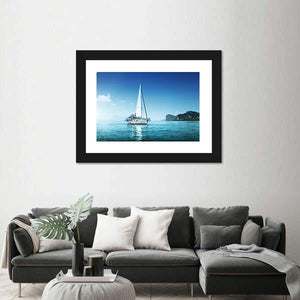 This beautiful canvas art captures a serene scene of a single mast sailboat gliding across tranquil blue waters, framed by distant islands. With its calming palette of blues and whites, it’s a perfect addition for any space that seeks a peaceful ambiance.
