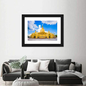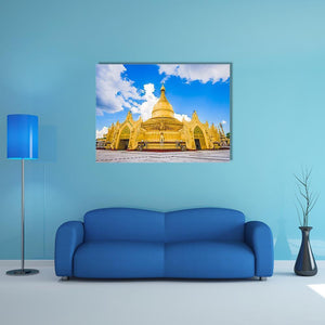 This canvas print depicts the golden Maha Wizaya Pagoda in Yangon, highlighting ornate gold detailing and arched entrances set against a cloudy blue sky. The centered, symmetrical composition and realistic rendering create a majestic, serene presence that suits modern living rooms and hallways.