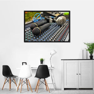 A close-up canvas print of microphones, a sound mixer, and silver headphones that conveys a technical, professional mood. The realistic, detailed image uses a black, silver, and blue palette with colorful mixer knobs, suited to a home studio, music room, or modern living space.