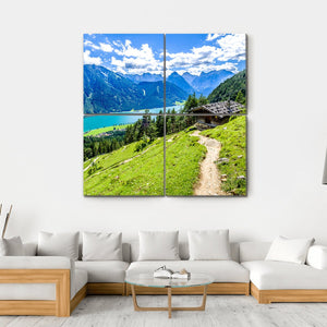 Capture the serene beauty of a mountain lake in Austria with this realistic canvas art. Featuring a wooden hut framed by lush greenery and a clear blue sky, it creates an inviting atmosphere perfect for nature lovers.