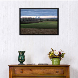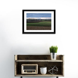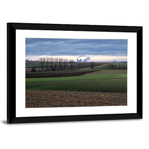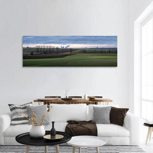Rolling green fields, bare trees and distant smokestacks create a somber, vast atmosphere in this panoramic canvas. The naturalistic scene—blue-gray sky and stormy clouds—fits well in modern or industrial-inspired rooms as a quiet, contemplative focal point.