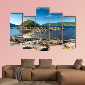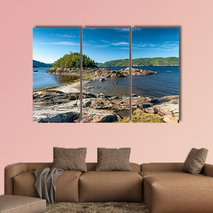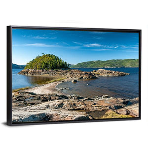 Saguenay Fjord in Canada shows a treed island, rocky shore, water and distant mountains beneath a clear summer sky. Rendered in a realistic style with blue, green, brown and grey tones, the print creates a serene, peaceful, natural atmosphere that suits modern, nature-inspired interiors.