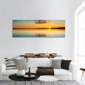 Sunset Over Sea Panoramic Canvas shows a calm sunset over water with a single cloud and the sunset reflected on the sea. The orange, blue, yellow and teal palette creates a serene, peaceful atmosphere that suits modern, minimalist décor.