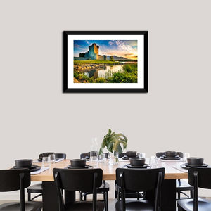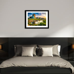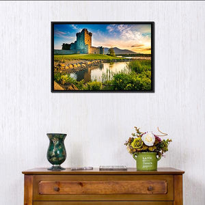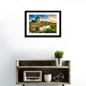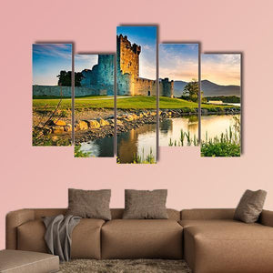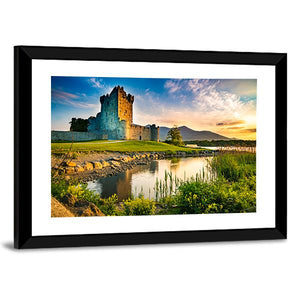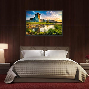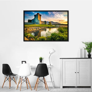 Ross Castle, Ireland canvas wall art shows a realistic landscape of a stone castle with battlements beside calm, reflective water and distant mountains under a warm sunset sky. The scene feels serene and picturesque, with blue, green, brown and orange tones and a historic mood. It suits living rooms and nature-themed spaces.