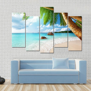 Immerse yourself in the tropical serenity of Anse Lazio Beach with this stunning canvas wall art. Featuring gentle waves, palm trees, and a distant sailboat, it captures the essence of a peaceful vacation by the ocean. The harmonious palette of blues and greens adds a calming touch to your space.