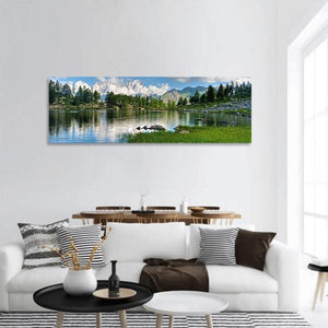 This panoramic photographic landscape captures Arpy Lake in Italy with a calm lake, snow-capped mountains, pine trees and a clear sky reflected in the water. Blues, greens, whites and grays create a serene, majestic, and tranquil mood that fits modern or nature-themed rooms.