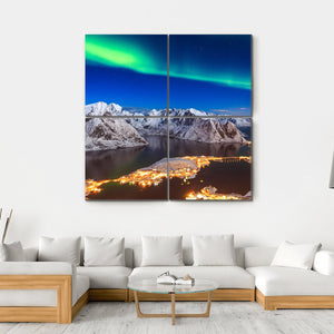 Experience the magic of the northern lights illuminating snowy mountains and a coastal town in Norway. This artwork captures a serene and awe-inspiring scene that brings the beauty of nature into your space.