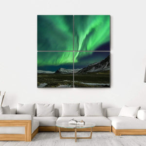 This captivating canvas art features the aurora borealis dancing over majestic mountains under a starry night sky. The serene green, black, and white palette evokes a magical atmosphere, making it a perfect addition to any nature-themed decor.
