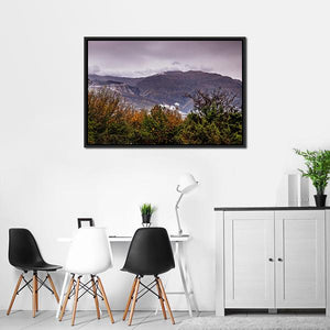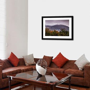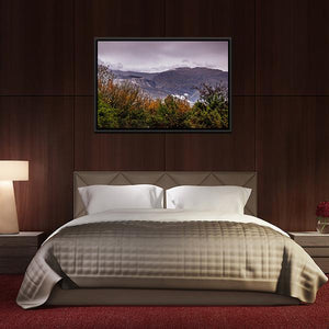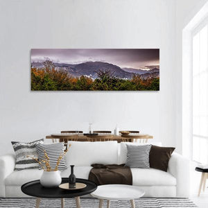 Autumn Landscape Panoramic Canvas Wall Art captures mountains, trees and a stormy autumn sky in a moody, atmospheric palette of grey, green, brown, orange and purple. The panoramic composition highlights autumn foliage and mountain peaks for a dramatic, contemplative scene. It suits modern or nature-inspired interiors that welcome an atmospheric focal piece.