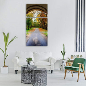A realistic autumn landscape captures a peaceful, serene tree-lined path beneath an archway of yellow and orange leaves. Wet asphalt and scattered fallen leaves add quiet detail, making this canvas a nature-inspired choice for modern living rooms or hallways.