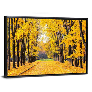 This canvas art features a serene tree-lined path blanketed in autumn leaves, capturing the warm glow of sunlight filtering through the trees. The peaceful palette of yellow, brown, and green evokes the calming spirit of fall, enhancing any nature-themed décor.