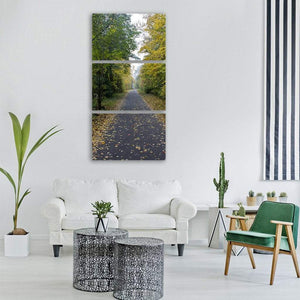 A realistic landscape of trees lining a leaf-strewn path, shown with wet pavement and a soft, foggy atmosphere. Muted greens, yellows, grays, and browns create a peaceful, autumnal mood with strong leading lines and depth. A calm choice for room decor, suited to modern or nature-themed interiors.