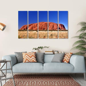 Ayers Rock (Uluru) is captured in a photorealistic canvas print, its sunlit red-ochre face rising above tall dry grass beneath a deep blue sky. The rule-of-thirds composition and sense of depth give the scene a serene, majestic feeling that suits modern or nature-inspired interiors.