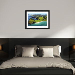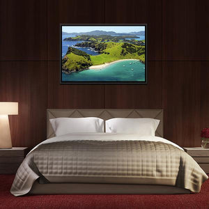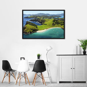 This panoramic canvas shows a wide aerial view of Waewaetorea Island’s bay with green hills and several sailboats anchored in clear turquoise water. The photorealistic image uses blues, greens, white, and brown to create a peaceful, scenic mood that fits coastal or modern interiors.