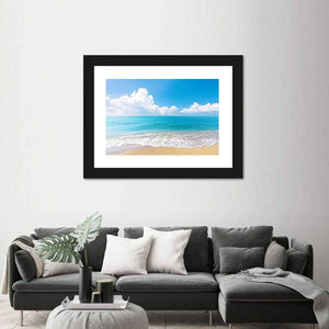 A photographic beach scene showing foaming waves rolling onto a tan shore beneath fluffy clouds and a blue–aqua sky. Its serene, peaceful mood suits coastal or modern rooms and adds a calm, natural touch to living spaces.