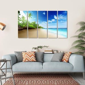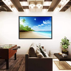 This canvas captures the serene beauty of a tropical beach on Mahe Island, featuring palm trees swaying gently against a backdrop of turquoise waters and a stunning sunset. The idyllic scene evokes a peaceful atmosphere, perfect for bringing a touch of nature into your home.