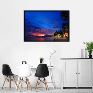 Beach Night Scene Canvas Wall Art captures a tropical beach at sunset with palm trees, calm water, and silhouetted islands. A tranquil, warm palette of blue, pink and orange creates a relaxed, exotic mood that works well in coastal or modern rooms like living rooms and bedrooms.