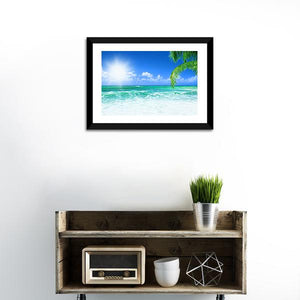 Ocean waves and a green palm frond meet under a bright sunburst in this panoramic beach print. The photorealistic scene feels serene, tropical, and refreshing with blue, turquoise and white tones and foaming waves. It suits coastal, modern, or tropical-themed rooms as calming wall decor.