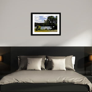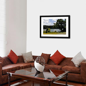 A panoramic canvas that captures a serene lake bordered by dense green forest, patches of tall grass, and smaller trees beneath a clear blue sky with white clouds. The photographic, realistic look and calming greens and blues suit modern or nature-inspired interiors seeking a peaceful focal piece.