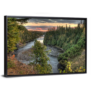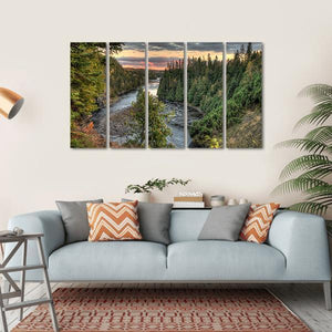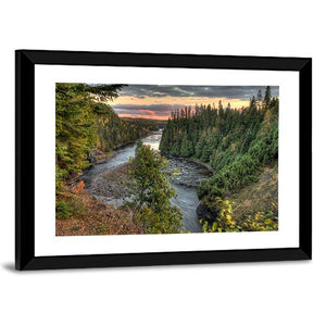 Capture the breathtaking beauty of Kakabeka Falls with this canvas wall art. Featuring a serene high-angle view of a rocky riverbed amidst a dense evergreen forest, the dramatic stormy sky adds depth to the landscape. This piece brings a touch of nature's tranquility into your space.