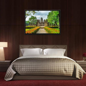 Photorealistic canvas print of Sukhothai Historical Park, showing ancient temple ruins, stone pillars and a garden path flanked by hedges. Muted greens, warm oranges and soft grays on an overcast day give the scene a peaceful, historic mood. This artwork fits home room decor and pairs well with modern or nature-inspired interiors.