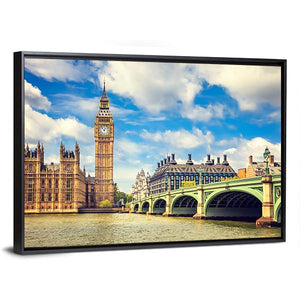 A photorealistic cityscape of Westminster Bridge with Big Ben and Parliament along the River Thames under a bright, sunny sky. Clouds and water reflections give the scene a lively, iconic feel that works well in modern living rooms or travel-themed spaces.