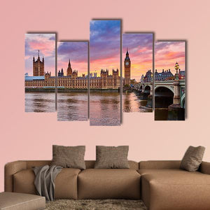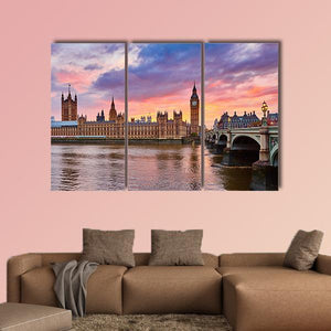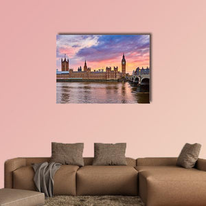 This photorealistic canvas captures the Palace of Westminster and Big Ben along the River Thames at sunset, with dramatic purple, pink and orange clouds and shimmering reflections in the water. The eye-level view creates a vibrant yet serene, slightly dramatic mood that suits modern rooms or a travel-inspired study.