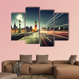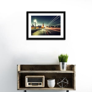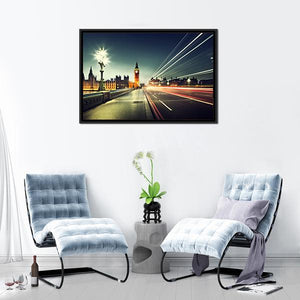 Big Ben From Westminster Bridge shows Big Ben and Parliament seen from Westminster Bridge at night, with streetlights and traffic light trails. A long-exposure treatment and a palette of dark blue, orange, yellow and white create a dynamic, modern urban mood. Works well with modern room decor such as living rooms and offices.