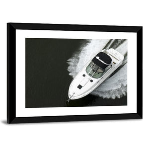 This canvas art features a dynamic aerial view of a speedboat slicing through water, capturing the exhilarating motion and wake. Its modern style and bold palette of black, white, blue, and gray make it a striking addition to any room.