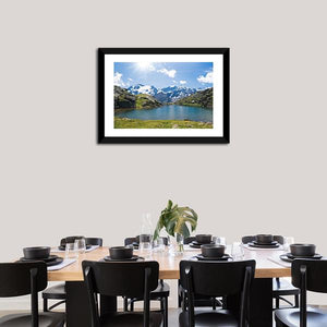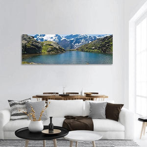 This panoramic canvas captures Black Lake in Italy, a calm mountain lake that mirrors snow-capped peaks and rocky, grassy hillsides. The realistic nature photography style and a palette of blues, greens, white and gray create a serene, majestic mood. Suited to living rooms, studies, or any room seeking quiet, nature-focused wall decor.