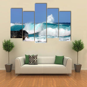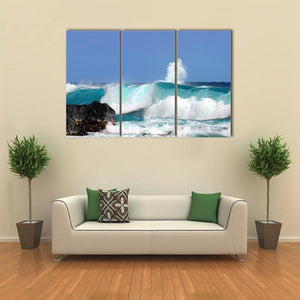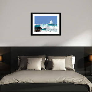 This captivating artwork features dynamic ocean waves crashing against large dark rocks, capturing the powerful essence of nature. The bright turquoise water and white sea foam evoke a sense of energy and wild beauty, making it a striking piece for your wall decor.