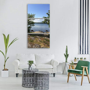 Blue Summer Lake Sweden captures a peaceful lakeside scene with two trees framing calm water that reflects the sky. The realistic composition uses blues, greens, browns, and grays to create a serene, natural mood suited to modern or nature-inspired rooms.