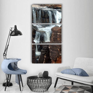 A realistic nature photograph of a multi-tiered waterfall cascading over dark rocks in a steep gorge, capturing motion and layered perspective. The brown, white, gray, and black palette gives a dynamic, powerful, and serene feel. Works well in modern living rooms or nature-inspired spaces as a striking wall decor piece.