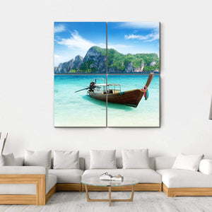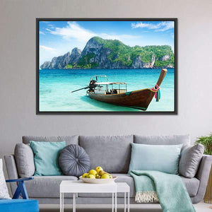 This canvas art features a tranquil longtail boat on the turquoise waters of Phi Phi Island, framed by lush green mountains and soft clouds. Its serene, tropical vibe makes it an excellent addition to any nature-themed decor.