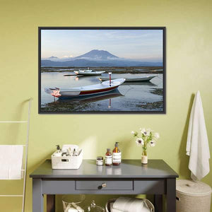 This canvas features small boats moored in shallow waters, set against a backdrop of mountains and a serene sky. The calming blues and grays create a peaceful atmosphere, making it a wonderful choice for any nature-inspired decor.