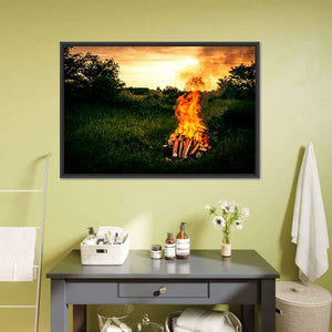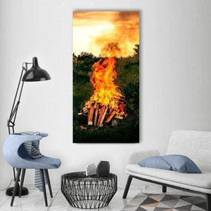 Bonfire At Camp shows a centered bonfire scene with flames licking upward, smoke billowing, and logs stacked in a pyramid shape beneath an evening sky. Rendered in warm oranges, golds, greens, and browns, this vibrant, dramatic canvas brings an intense, fiery mood that suits nature-focused or modern rooms.