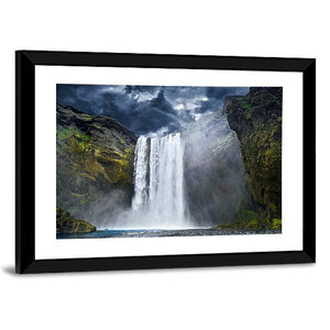 Experience the power and majesty of a stunning waterfall in Iceland, surrounded by cliffs under a stormy sky. This artwork captures the dramatic beauty of nature, with mist rising from the falls and lush green moss contrasting against dark, cloudy hues.