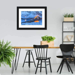 A panoramic canvas of a bridge in the Lofoten Islands, framed by a snowy night and calm water reflections. Streetlights cast warm orange highlights across cool blues, turquoise and gray for a serene yet dramatic atmosphere. Suited to modern living rooms, entryways, or offices seeking nature-inspired wall art.